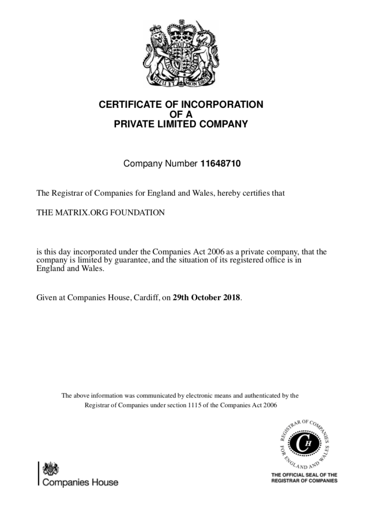 - You can read the initial Articles of Association here (although all the rest of it is fairly generic legal boilerplate for a non-profit company at this point which hasn't yet been tuned; the Matrix-specific stuff is Article 4 as quoted above). You can also see the initial details of the Foundation straight from the horse's mouth over at https://beta.companieshouse.gov.uk/company/11648710.
